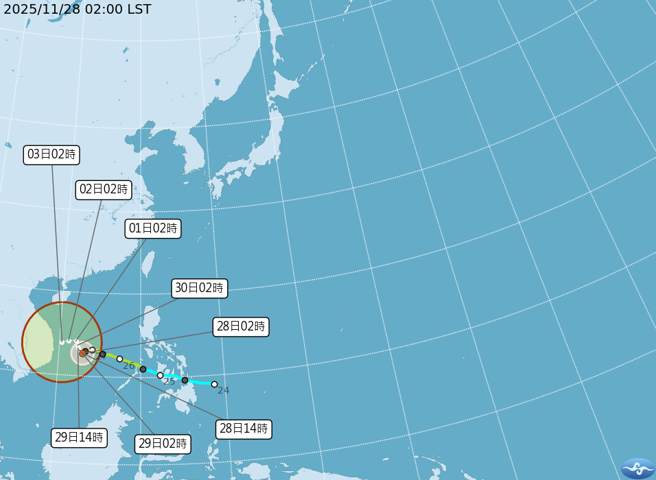 11/28中颱天琴路徑潛勢預報圖。氣象署提供