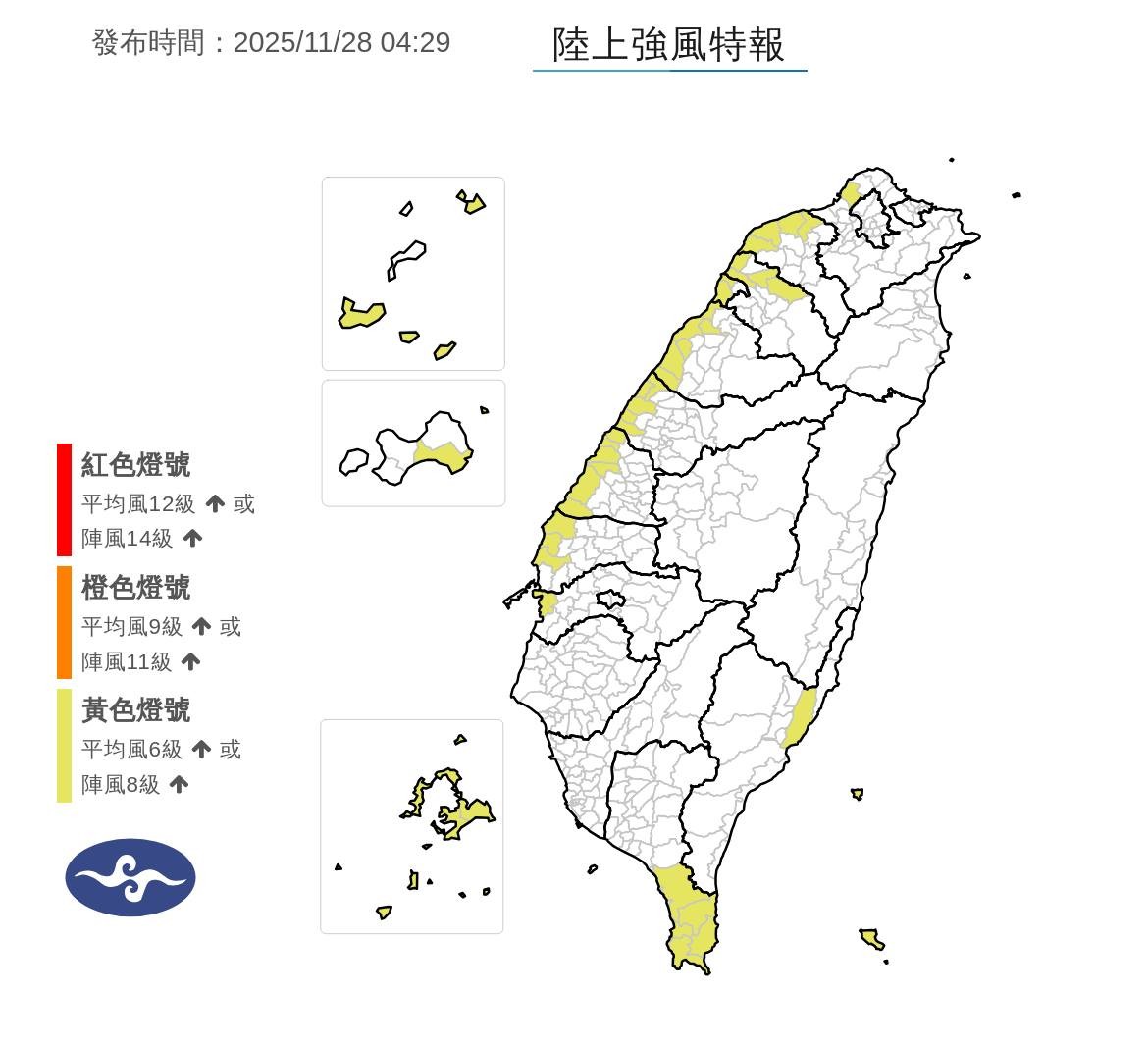 此外,東北風持續偏強,氣象署針對迎風多縣市發布陸上強風特報,28日晨至29日晚上新北市、桃園市、新竹市、新竹縣、苗栗縣、臺中市、彰化縣、雲林縣、嘉義縣、屏東縣、臺東縣(含蘭嶼、綠島)、澎湖縣、金門縣、連江縣局部地區有平均風6級以上或陣風8級以上發生的機率(黃色燈號),請注意在戶外請小心路樹、不堅固建築或定置物被強風吹落之碎片;戶外工作者請注意安全;加強牢固戶外物品;行車減速慢行,留意大眾運輸延誤訊息。