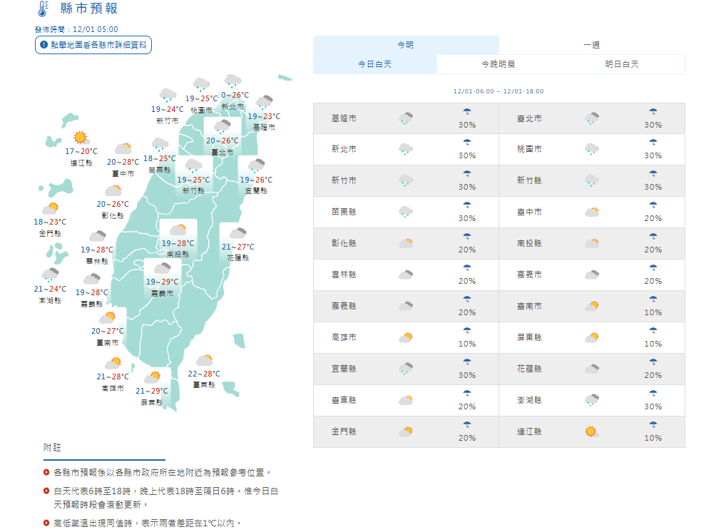 今日(12/1)上午受中層雲系通過影響,新竹以南地區仍有零星降雨,桃園以北、宜蘭地區亦有局部短暫雨,各地白天高溫約26至29度之間,屬於白天舒適、早晚涼的天氣。明日(12/2)晚間東北季風增強後,北部低溫下探12度,且將一路冷至週五。中央大學大氣科學系兼任副教授吳德榮表示,下波冷空氣會讓台北明顯降溫,不過威力距離大陸冷氣團還差一點點,預估台北測站應會降至15度。