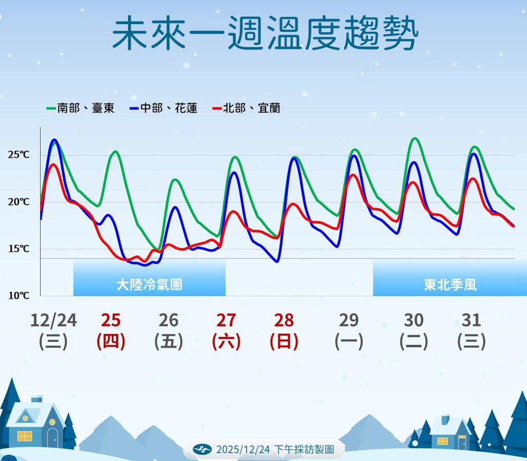 今日(12/25)大陸冷氣團南下,各地氣溫出現明顯下降,清晨最低溫落在新北石門富貴角,僅13.2度,北部及宜蘭地區氣溫越晚越低,且整天濕冷,預估今晚至明日(12/26)將是這波冷氣團最冷的時候,本島平地可能降至10度左右。