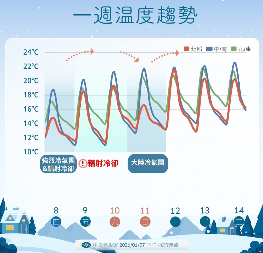 吳德榮接著指出,根據最新模式模擬顯示,下週一白天至週三(1/14)冷空氣漸弱、白天氣溫出現明顯回升,各地天氣晴朗,不過仍持續因強輻射冷卻影響,早晚氣溫偏低、日夜溫差很大,未來一週日夜溫差變化仍很劇烈,提醒家中若有年長者或患有心血管疾病者,需悉心關照。