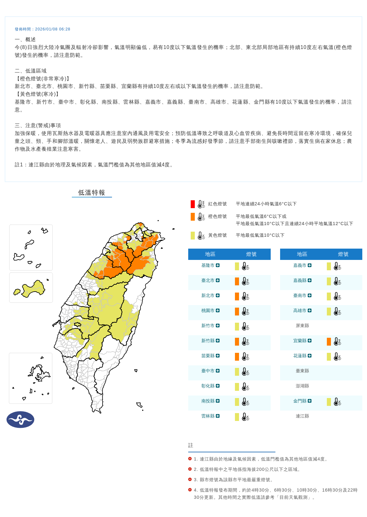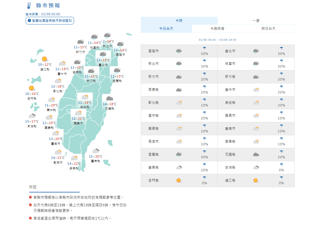 今日(1/8)持續受強烈大陸冷氣團影響,各地清晨寒冷,氣象署再度發布低溫特報,其中雙北、桃園市、新竹縣、苗栗縣、宜蘭縣有持續10度左右或以下氣溫發生機率,其餘縣市除屏東、台東、澎湖及馬祖外,皆有出現10度以下低溫可能性,請民眾注意保暖。