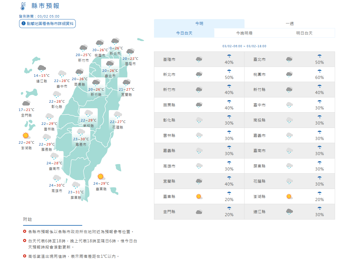 今日(3/2)天氣暖熱,全台各地溫度約26至30度,南部氣溫可達32度,不過午後鋒面通過變天,加上東北季風增強,建議民眾隨身攜帶雨具。明日(3/3)元宵節又逢華南雨區東移,全台連續兩天有雨。