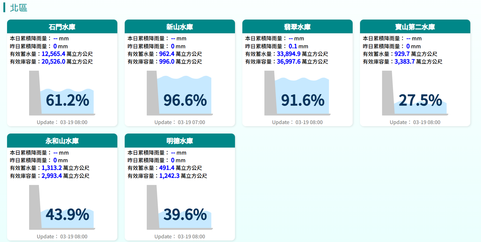 北區水庫水情,統計至3月19日上午8時。翻攝經濟部水利署網站