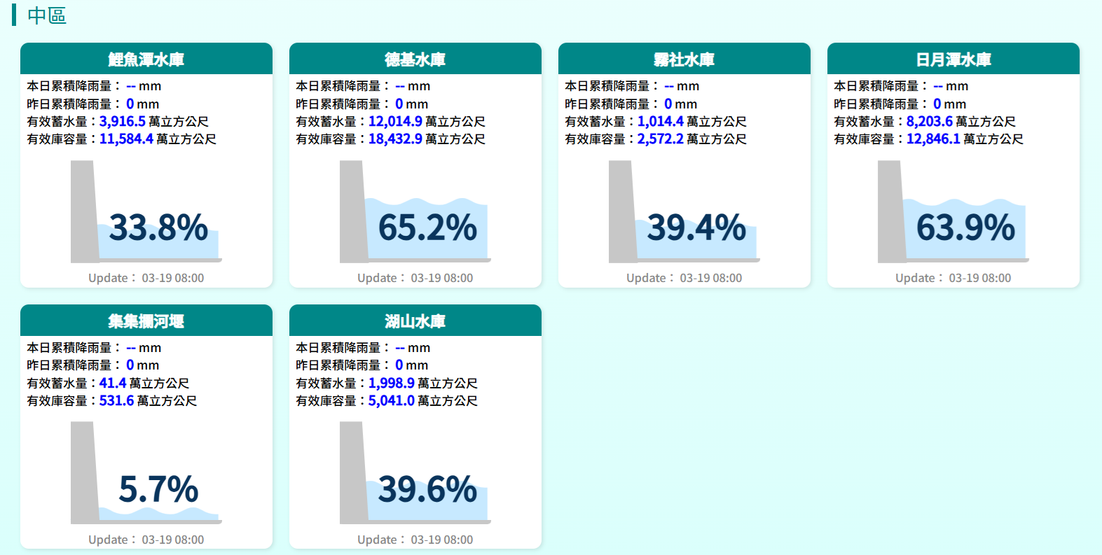 根據水利署統計,北部水庫中,寶山第二水庫蓄水量27.5%、明德水庫39.6%;中部鯉魚潭水庫33.8%、霧社水庫39.4%、湖山水庫39.6%;南部仁義潭水庫32.7%、阿公店水庫37.5%,全台規模最大的曾文水庫僅29.1%。