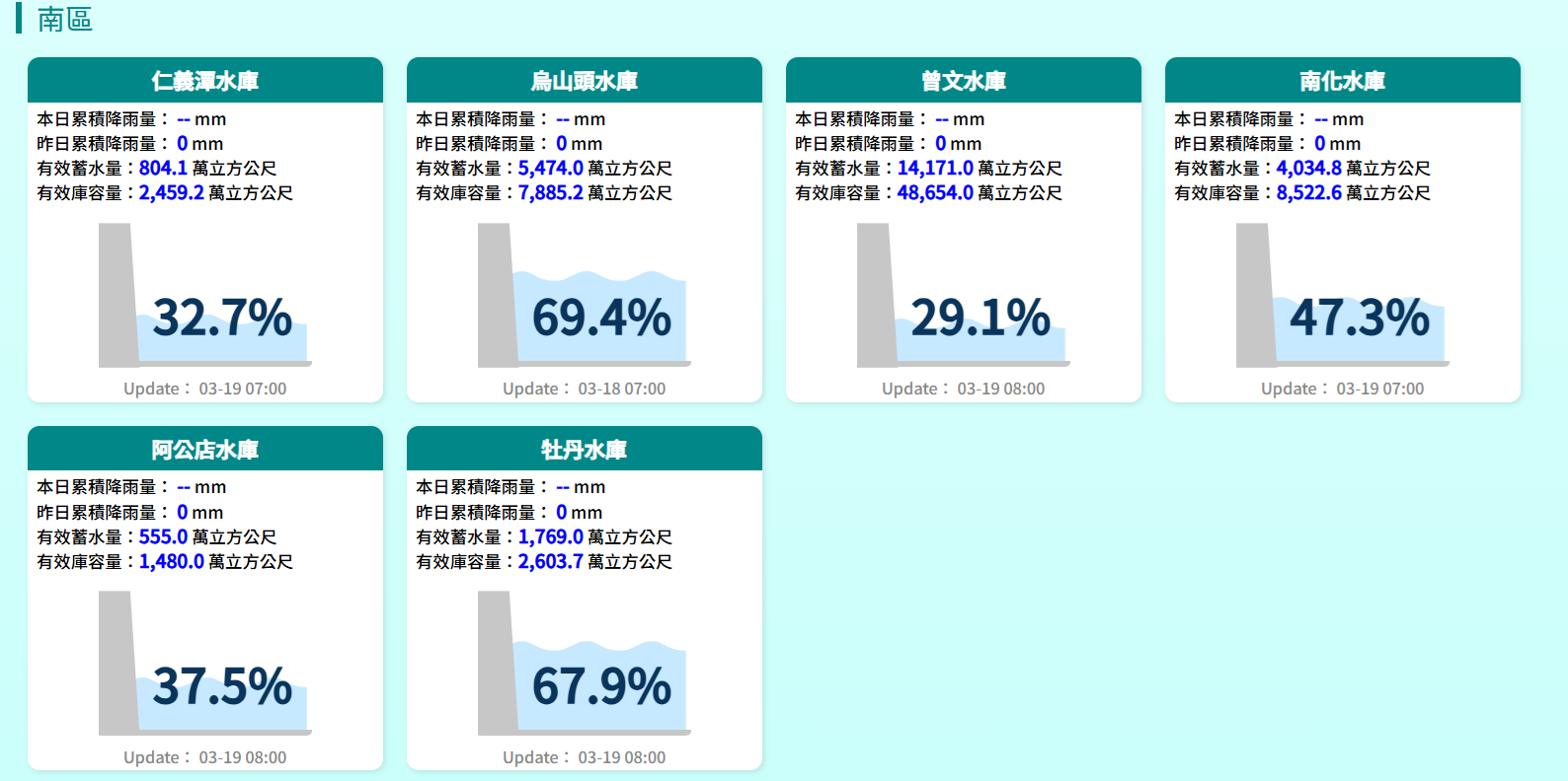 南區水庫水情,統計至3月19日上午8時。翻攝經濟部水利署網站