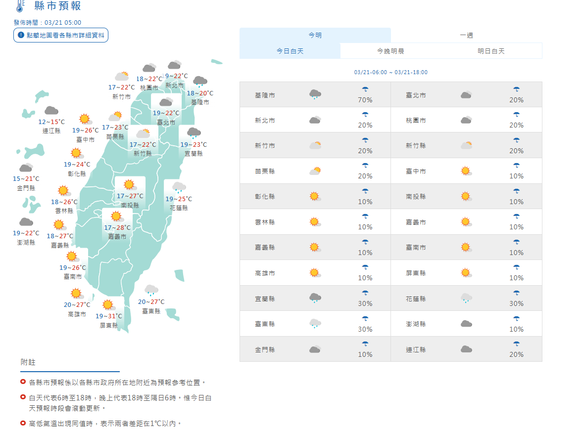 中央氣象署指出,今(3/21)日持續受到東北季風影響,加上有一道鋒面停留在台灣東北部海面,迎風面天氣較不穩定。桃園以北、東半部地區及恆春半島不定時有局部短暫陣雨,竹苗山區也有零星短暫陣雨,其他地區大致為多雲到晴,午後中南部山區則有局部短暫陣雨。