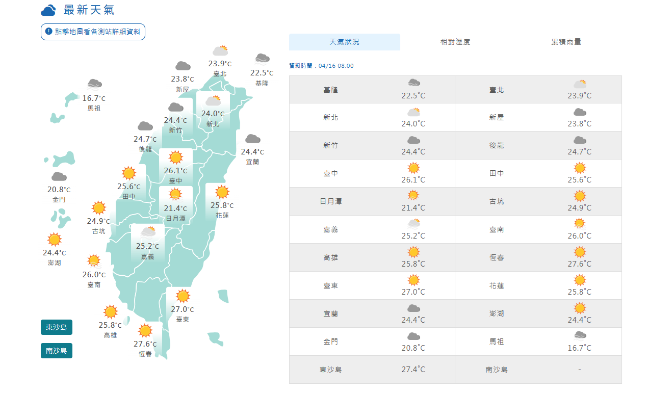 氣象署表示,今天華南至台灣上空水氣稍多,中部以北、宜蘭有零星短暫陣雨,午後各地山區有局部短暫陣雨;各地高溫約28至31℃,低溫約22至25℃。