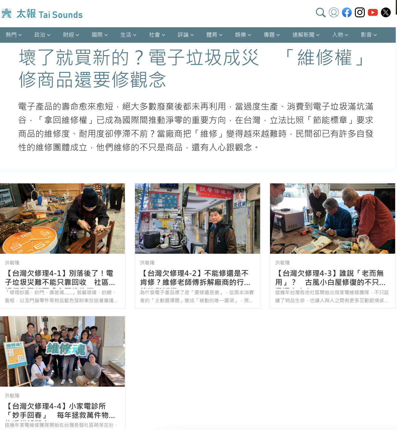 太報專題「壞了就買新的?電子垃圾成災 『維修權』修商品還要修觀念」獲114年度消費者權益報導獎佳作。