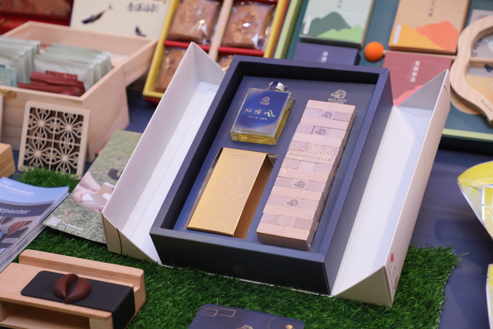 盧秀燕表示,台中市禮盒內容包含大安農會金磚米、九降風白蘭地及木匠兄妹手工玩具,兼具好吃、好喝與好玩,並融入碳盤查概念,展現環保心意。包裝設計則由台中明道中學擔綱,充分展現在地特色。