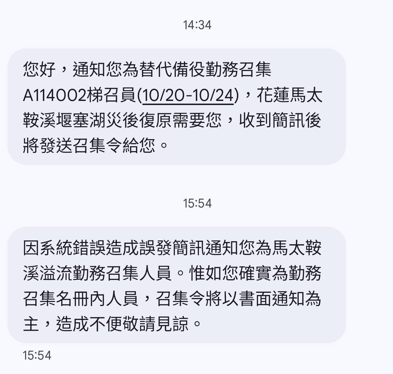 馬太鞍溪堰塞湖溢流,光復鄉災情慘重,花蓮地區昨許多民眾不分男女都收到召集替代備役勤務的簡訊,內容寫著「通知您為替代備役勤務召員,花蓮馬太鞍溪堰塞湖災後復原需要您,收到簡訊後將發送召集令給您」,但一小時候又收到另一則簡訊,說明系統誤發,若為勤務召集名冊內人員,通知將以書面為主。