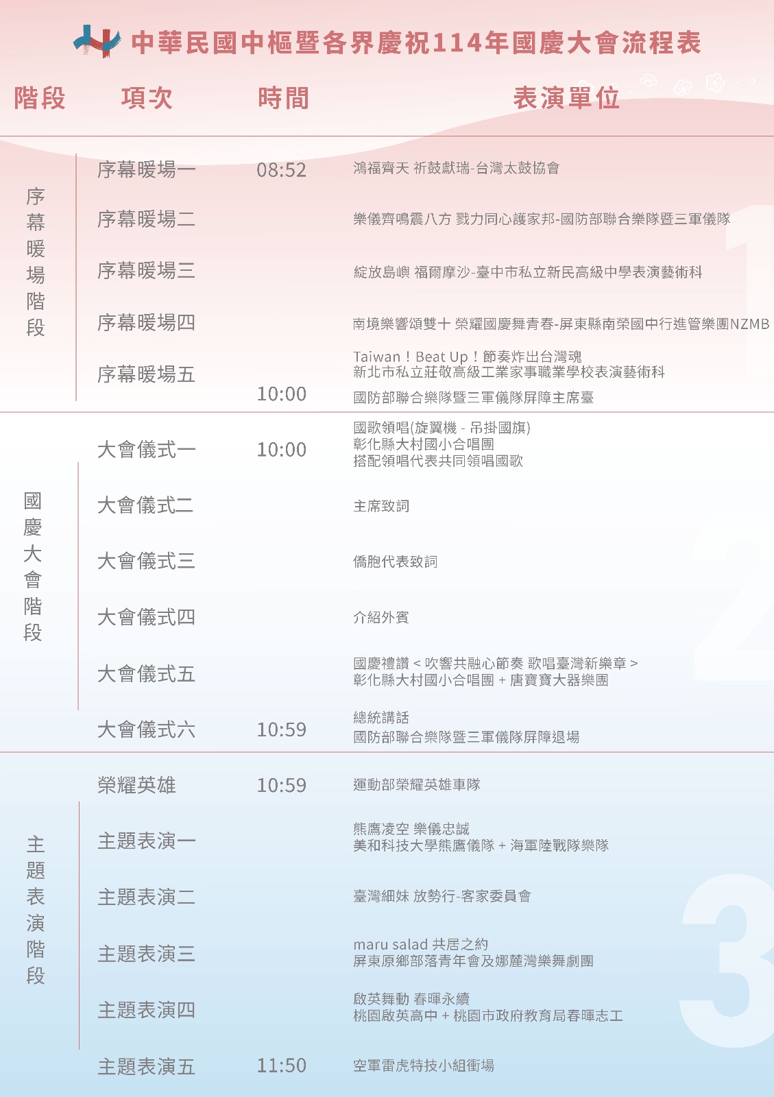 國慶大會國慶大會在總統府前凱德格蘭大道舉行,典禮融合傳統與創新,延續國軍空中分列式等經典橋段,依序維序幕暖場、國慶大會、主題表演進行。