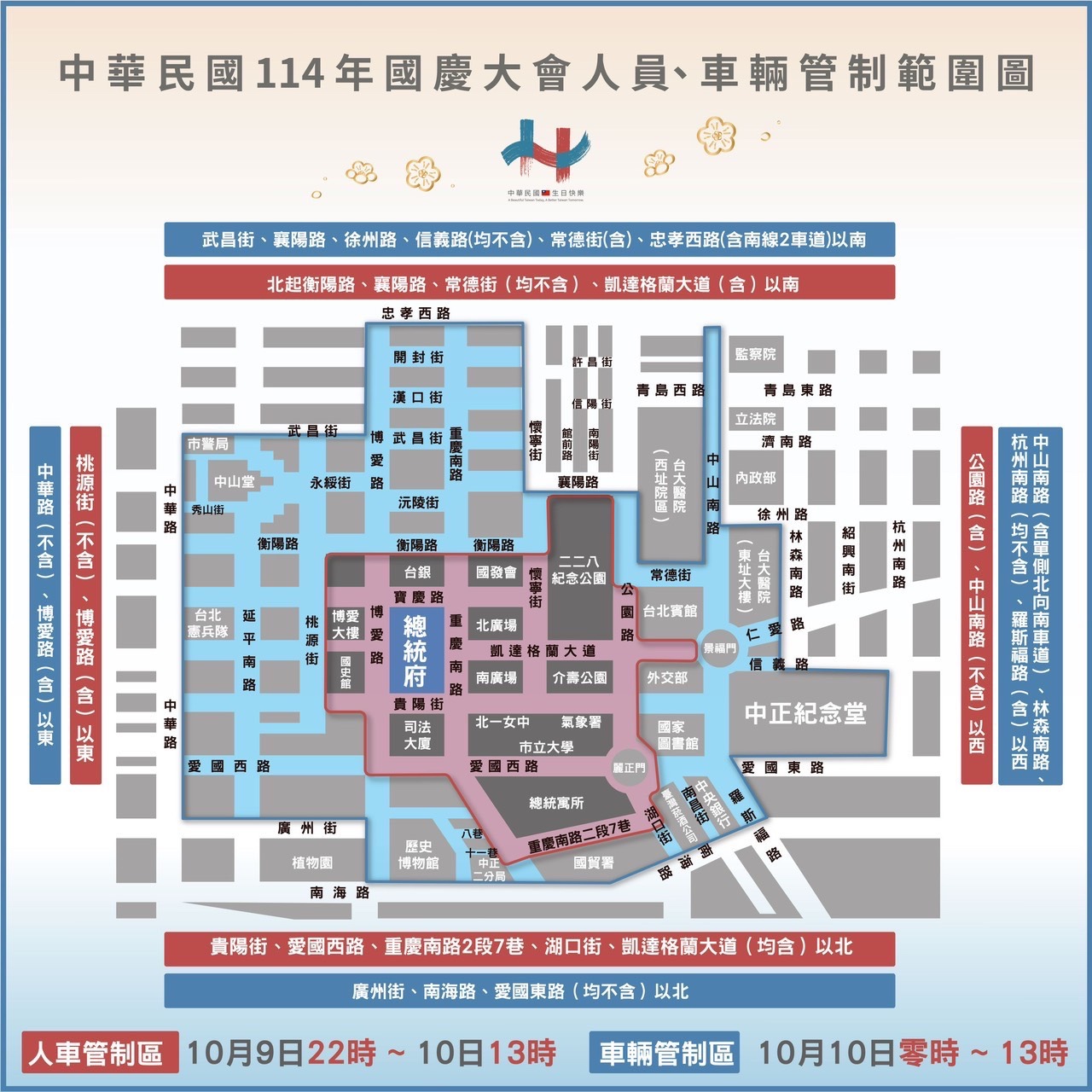 因應雙十國慶慶典活動,台北市警察局從10月9日晚間10點起至10月10日下午1點實施分階段交通管制,範圍涵蓋總統府周邊多條主要幹道。