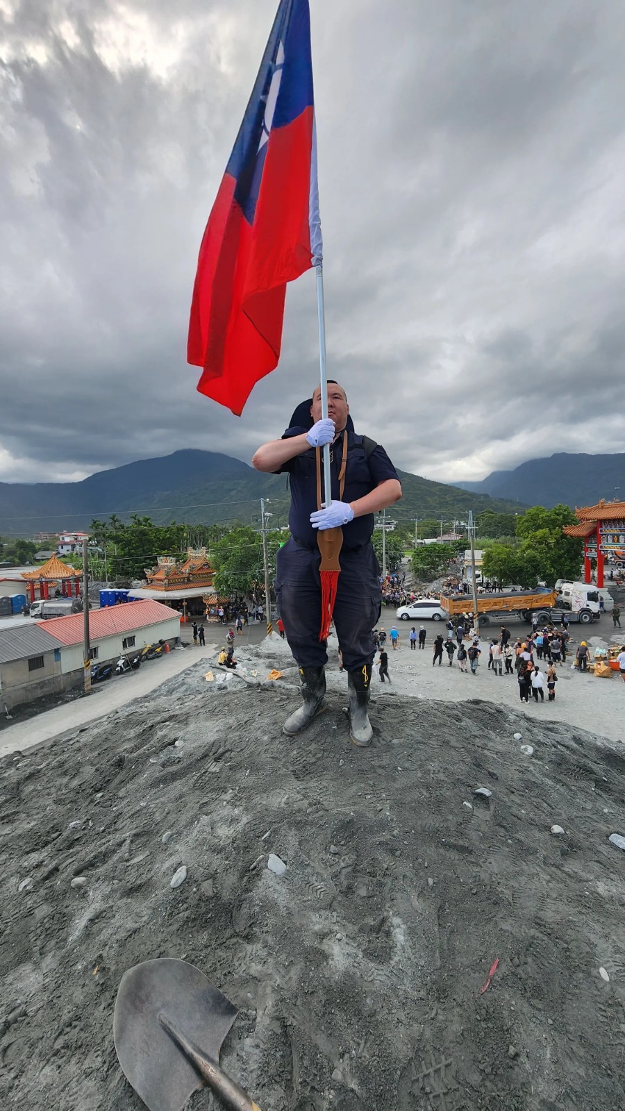 昨天(10/10)是114年國慶,連假首日,災區花蓮縣光復鄉仍有許多志工與國軍為了讓災民早日恢復正常生活,在高溫下挖土清淤。一名「國旗超人」為了讓志工們感受國慶氛圍,扛了一面大國旗到場為大家打氣,陸續有人找他合照、唱國歌,許多志工在泥沙堆積成的土丘上與國旗合照,連國軍弟兄也一起揮舞國旗,畫面曝光後,令網友感動不已。