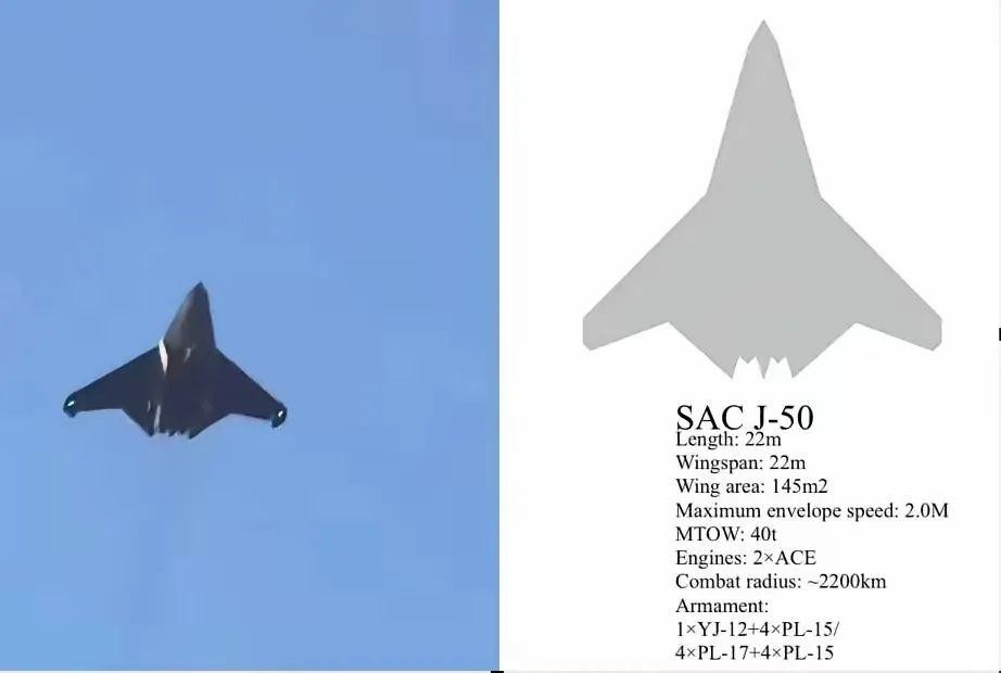 另外,根據先前曝光的殲-50照片與資料,全球權威的軍事刊物《詹氏防衛週刊》(Jane’s Defense Weekly, JDW)今年初進行的分析指出,中國沈飛這一架具備內匿蹤能力的六代戰機「殲-50」六代機,機身長度約22公尺、翼展22公尺,主翼面積為145平方公尺,飛行包絡線內最大飛行速度為2馬赫(音速的兩倍),最大起飛重量為40公噸,戰鬥半徑約為2200公里。