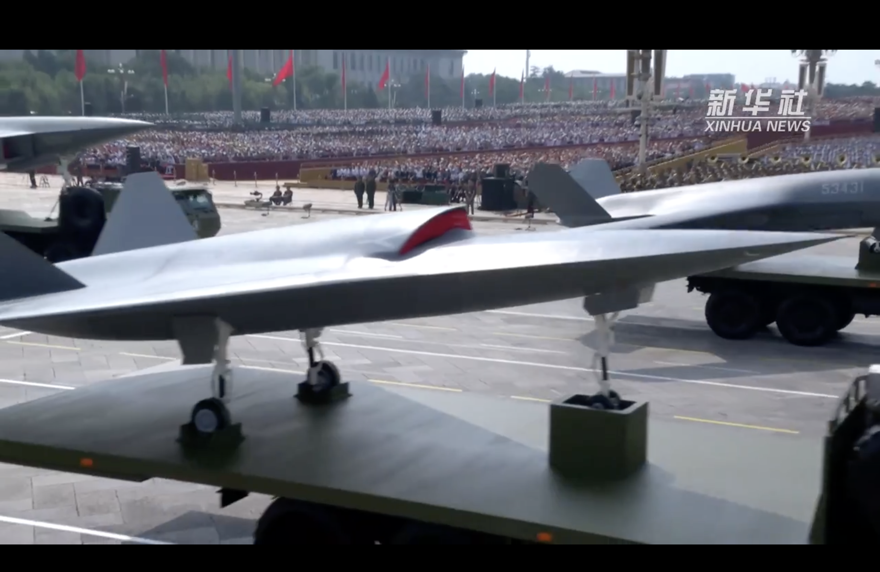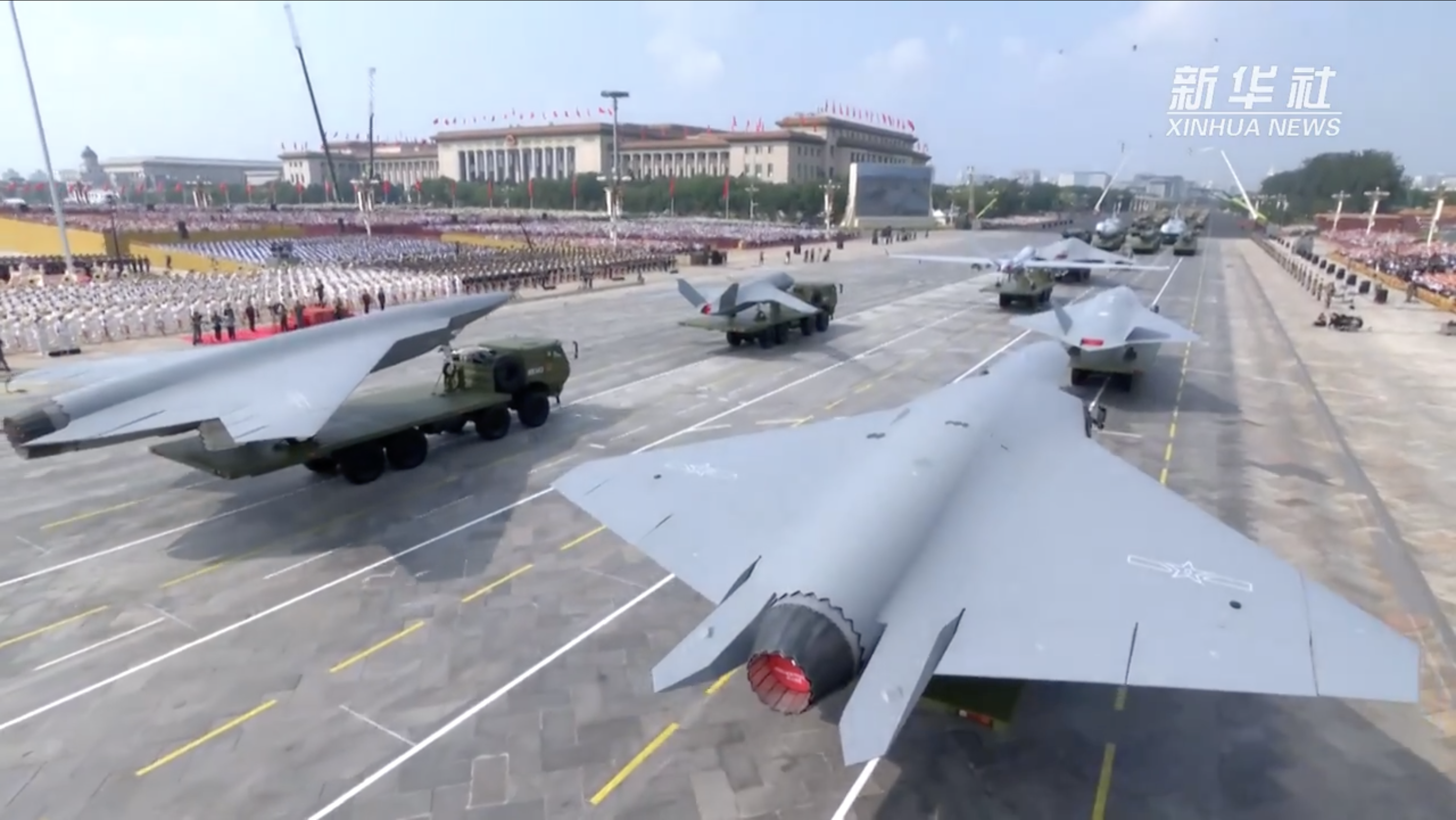 中國93閱兵展出2種新型無尾翼無人機,右方外型類似縮小版殲-36,為高階版彈艙「忠誠僚機」,左方則近似殲-50縮小版,同樣能攜帶彈藥。截自新華網