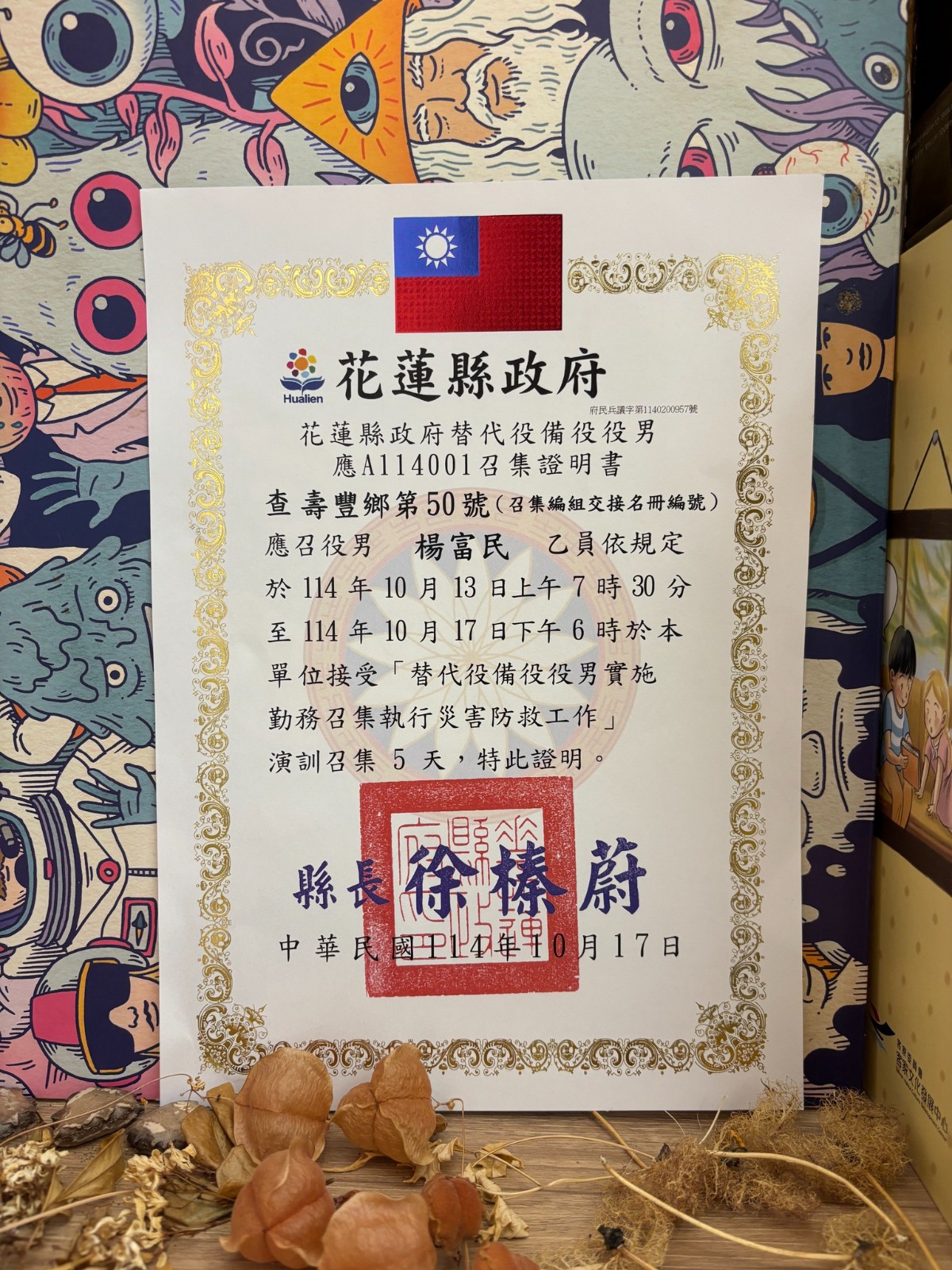 花蓮縣社區工作者楊富民在臉書發文貼出替代役備役役男召集證明書,顯示從2025.10.13起至10.17共五天執行災害防救勤務,並指出在光復鄉救災遭遇縣府不重視專長分配工作、裝備不足各種疏失。摘自楊富民臉書