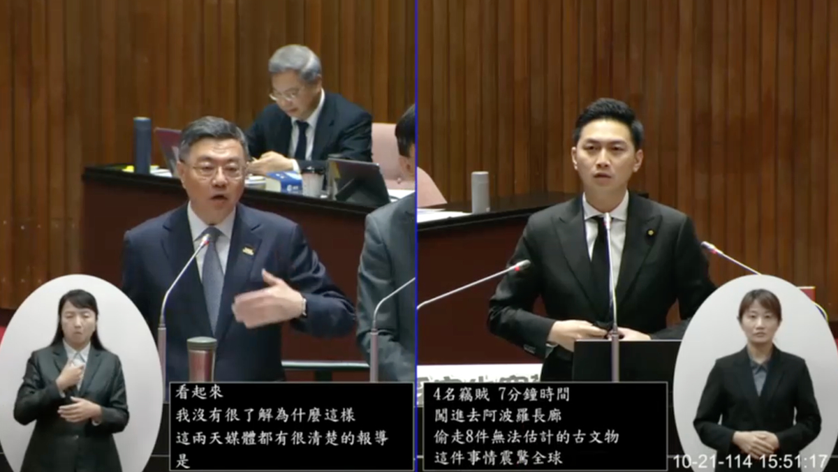 法國巴黎羅浮宮(Louvre Museum)本月19日發生搶案,蒙面歹徒趁館舍施工之際,闖入館內最具象徵意義的「阿波羅長廊」(Galerie d’Apollon),只花7分鐘就竊走拿破崙與約瑟芬皇后珍藏的9件珠寶。國民黨立委廖偉翔今天下午質詢行政院長卓榮泰時指出,連羅浮宮號稱全世界最好的保全措施都遭搶,發生這事件震驚全球,看到這事件,行政院、故宮博物院等單位有沒有什麼做法?
