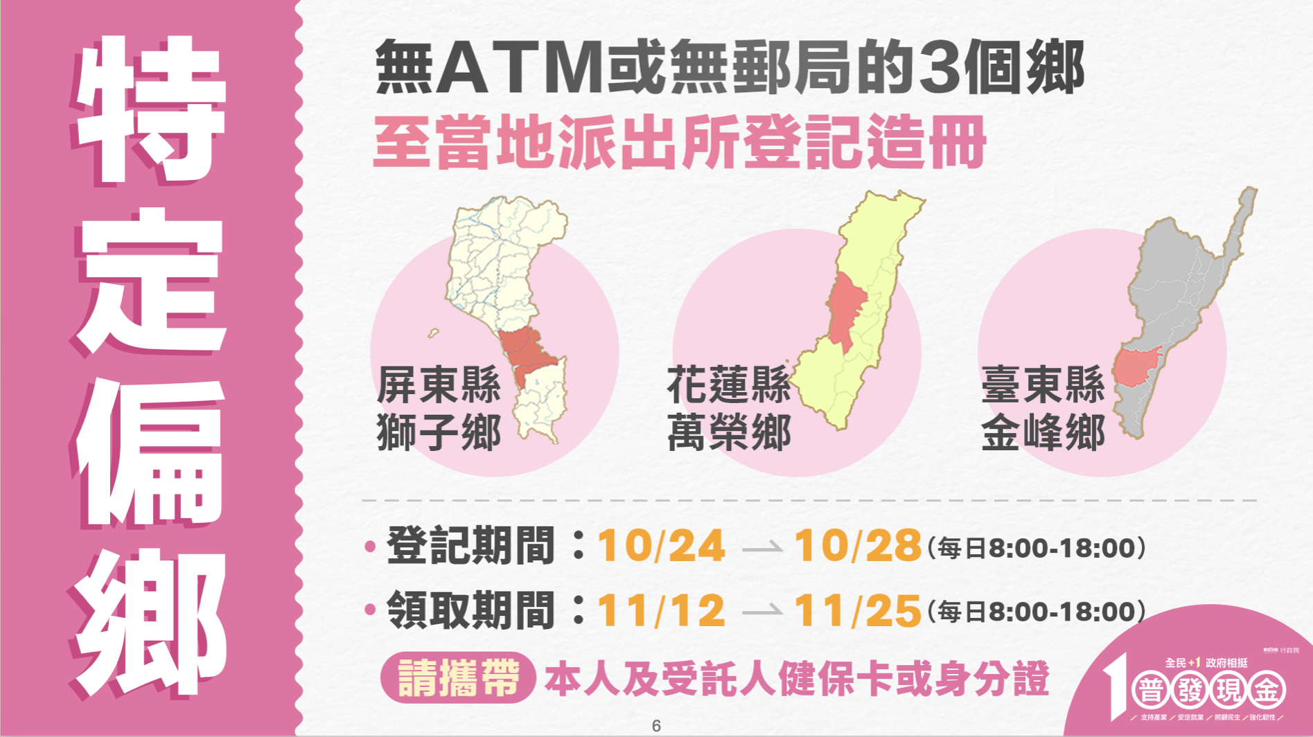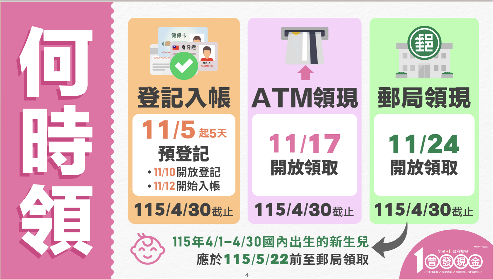 總統府今(10/23)公告中央政府因應國際情勢強化經濟社會及民生國安韌性特別預算案,行政院晚間舉行記者會指出,普發現金共5個發放管道包含登記入帳、ATM領現、郵局領現、直接入帳以及造冊發放,登記入帳預計11月5日開放預登記,最快11月12日入袋,11/17開放ATM領現,《太報》整理懶人包,一次看懂領取資格、流程與時程。