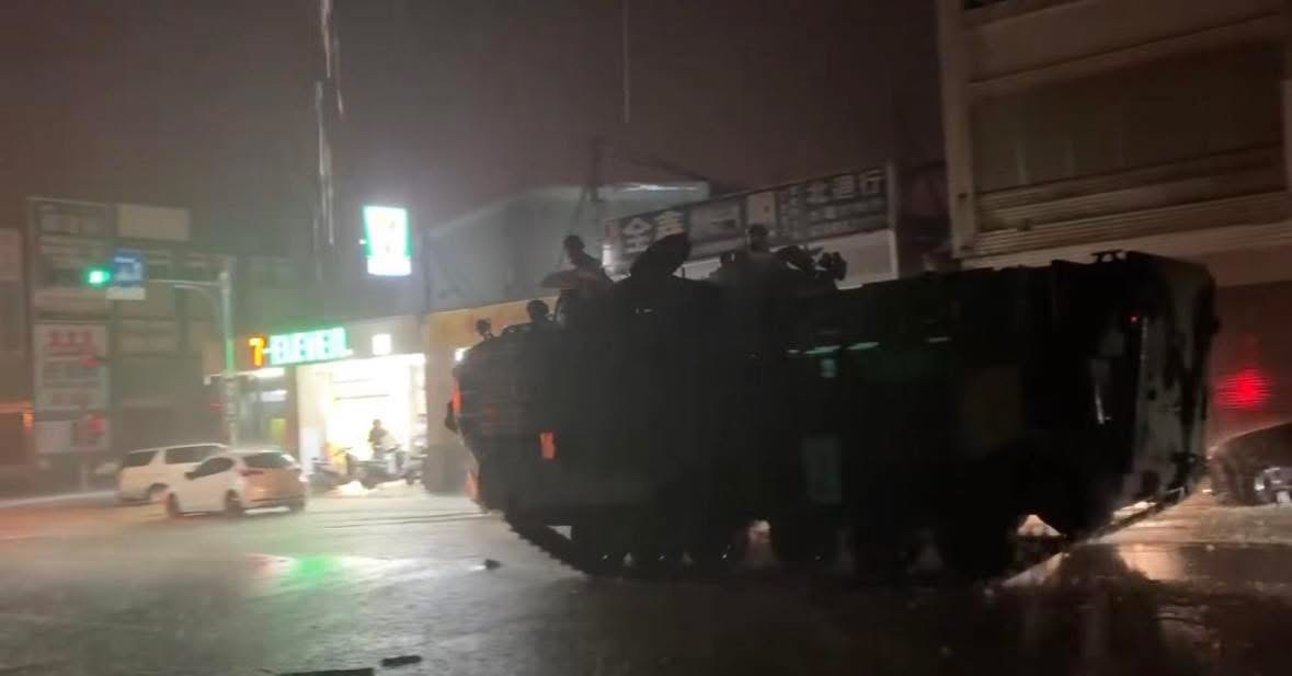 海軍陸戰隊車2025.11.11晚間出動AAV7兩棲突擊車深入因鳳凰颱風豪雨、積水嚴重的蘇澳地區,救出民眾。截自爆料公社粉專