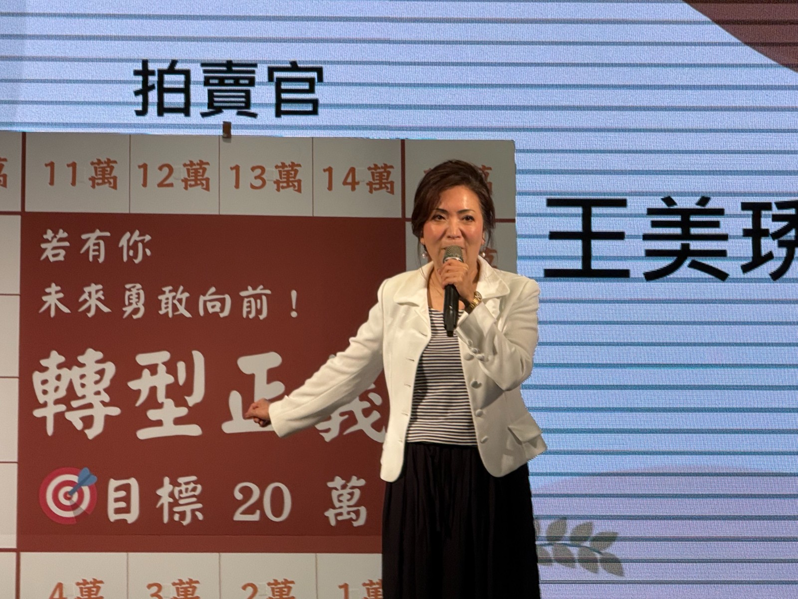 辜寬敏基金會董事長王美琇擔任第一位拍賣官,率先捐出10萬元,並帶動轉型正義基金會董事長陳秀麗跟進,不到5分鐘內就迅速完成募集20萬元推動轉型正義的募款目標。