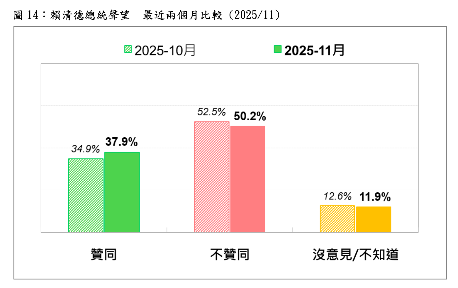 圖14:賴清德總統聲望—最近兩個月比較 (2025/11)。台灣民意基金會提供