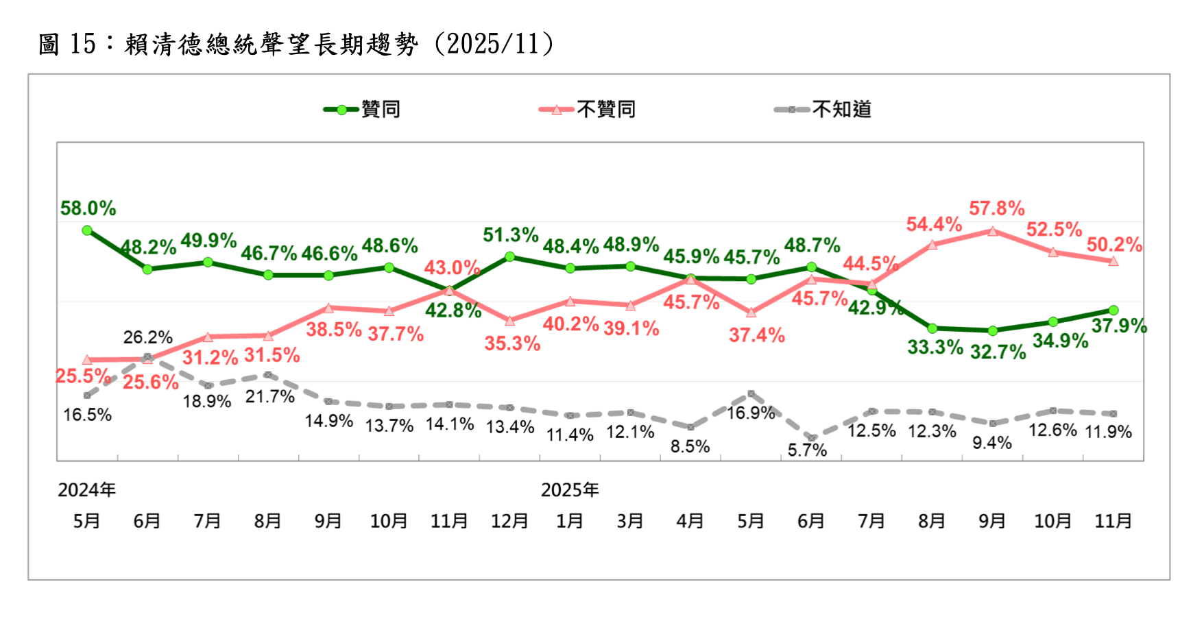 圖15:賴清德總統聲望長期趨勢 (2025/11)。台灣民意基金會提供