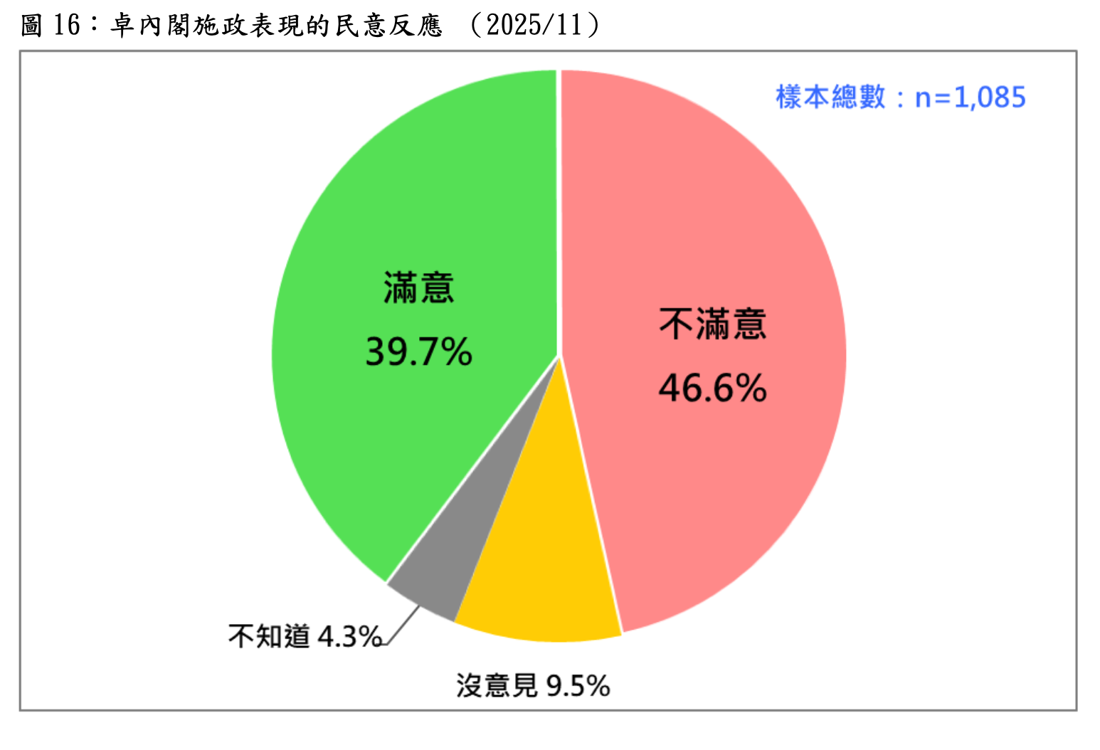 圖16:卓內閣施政表現的民意反應 (2025/11)。台灣民意基金會提供