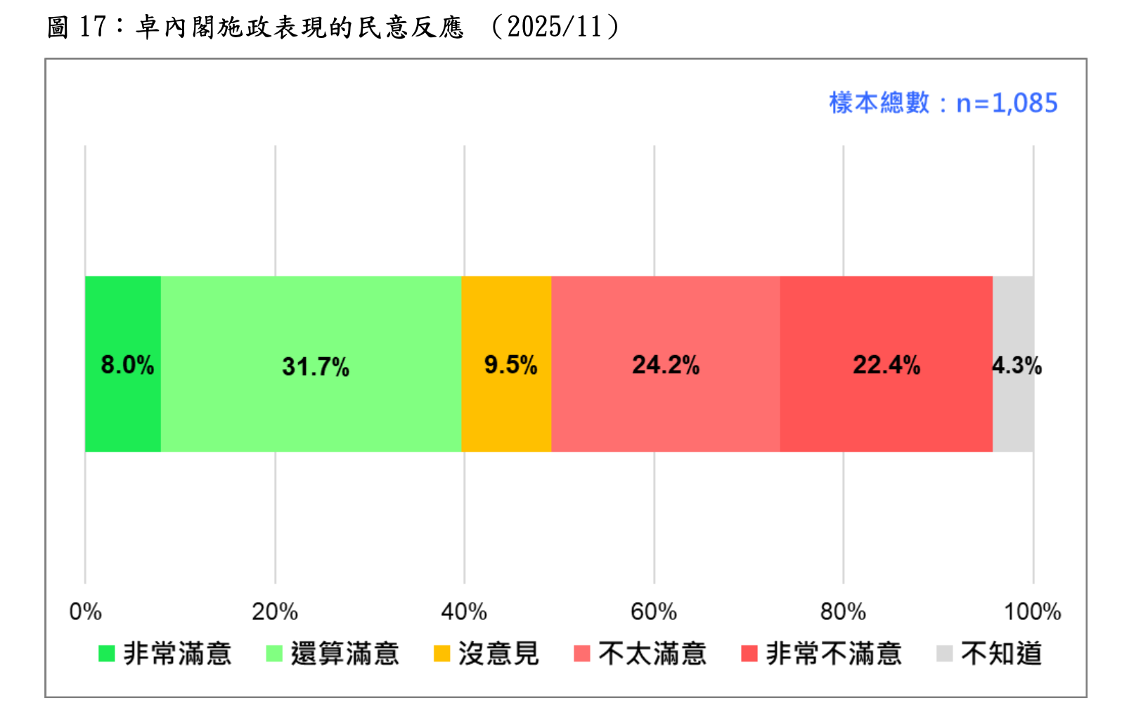 圖17:卓內閣施政表現的民意反應 (2025/11)。台灣民意基金會提供