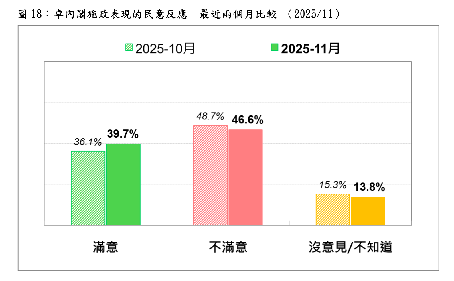 圖18:卓內閣施政表現的民意反應—最近兩個月比較 (2025/11)。台灣民意基金會提供