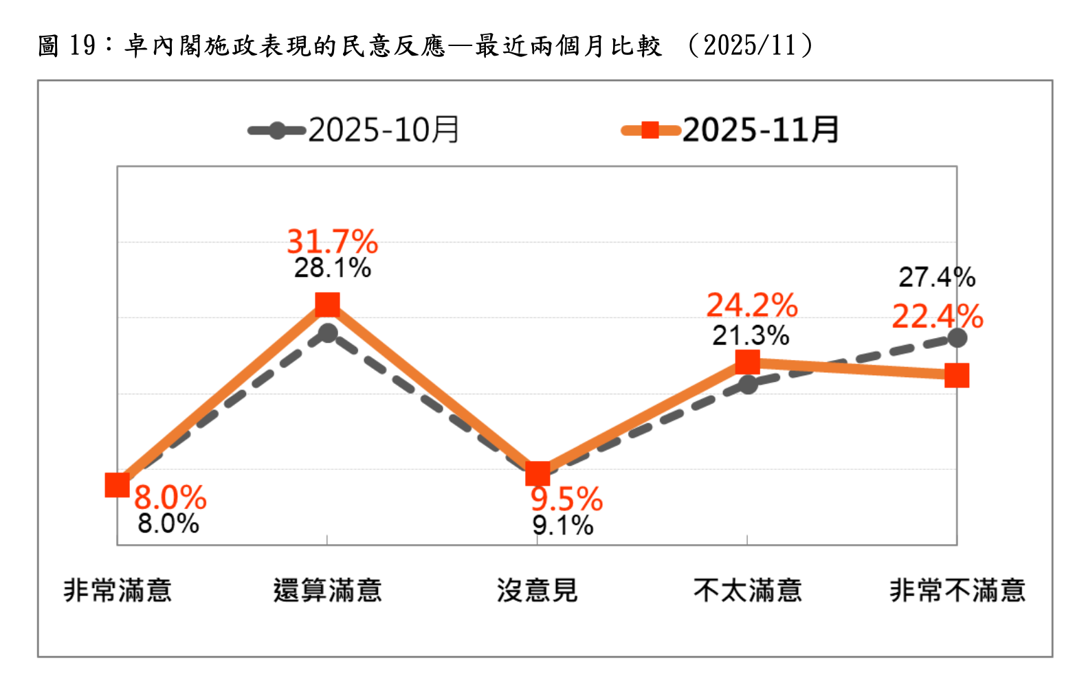 圖19:卓內閣施政表現的民意反應—最近兩個月比較 (2025/11)。台灣民意基金會提供