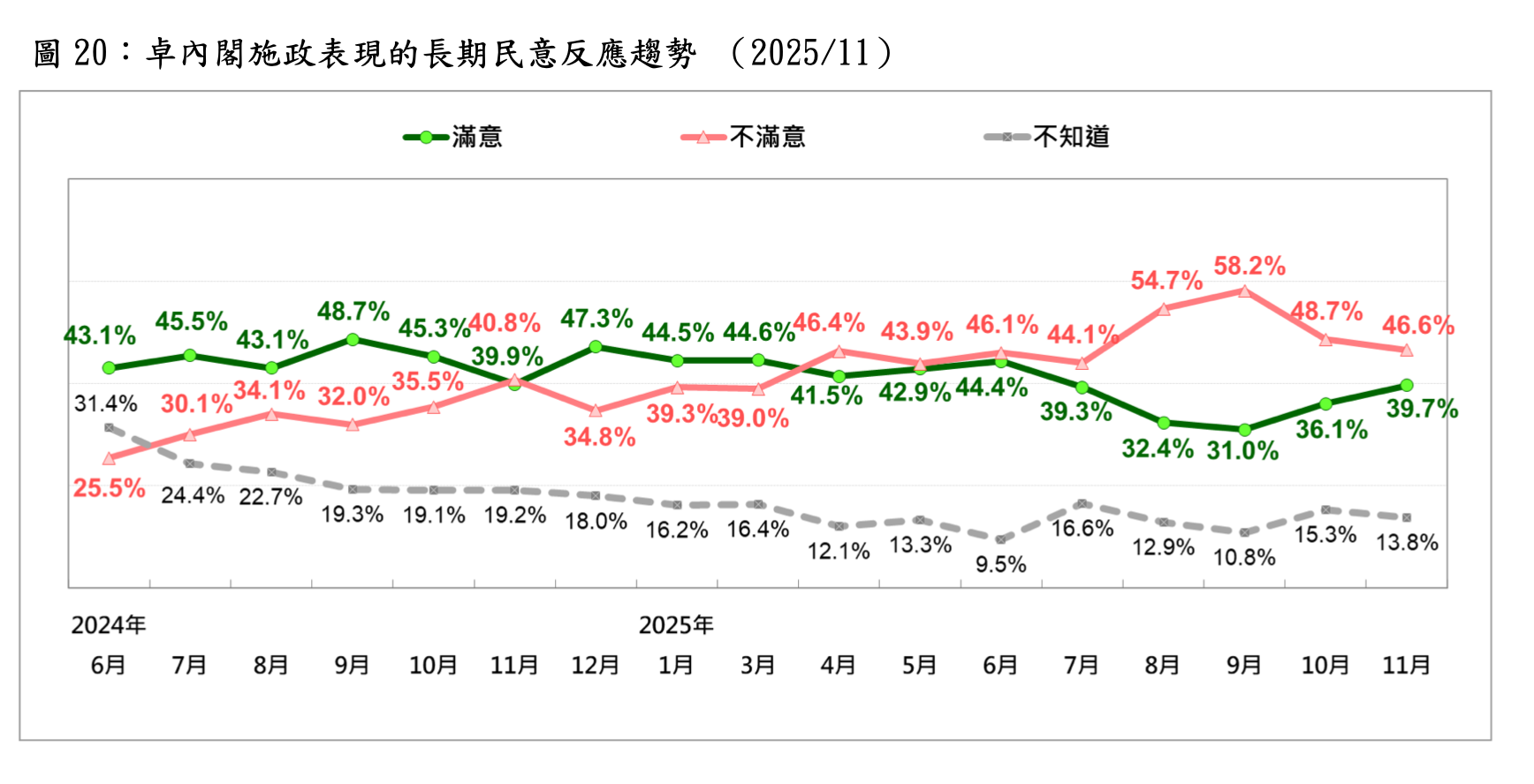 圖20:卓內閣施政表現的長期民意反應趨勢(2025/11)。台灣民意基金會提供