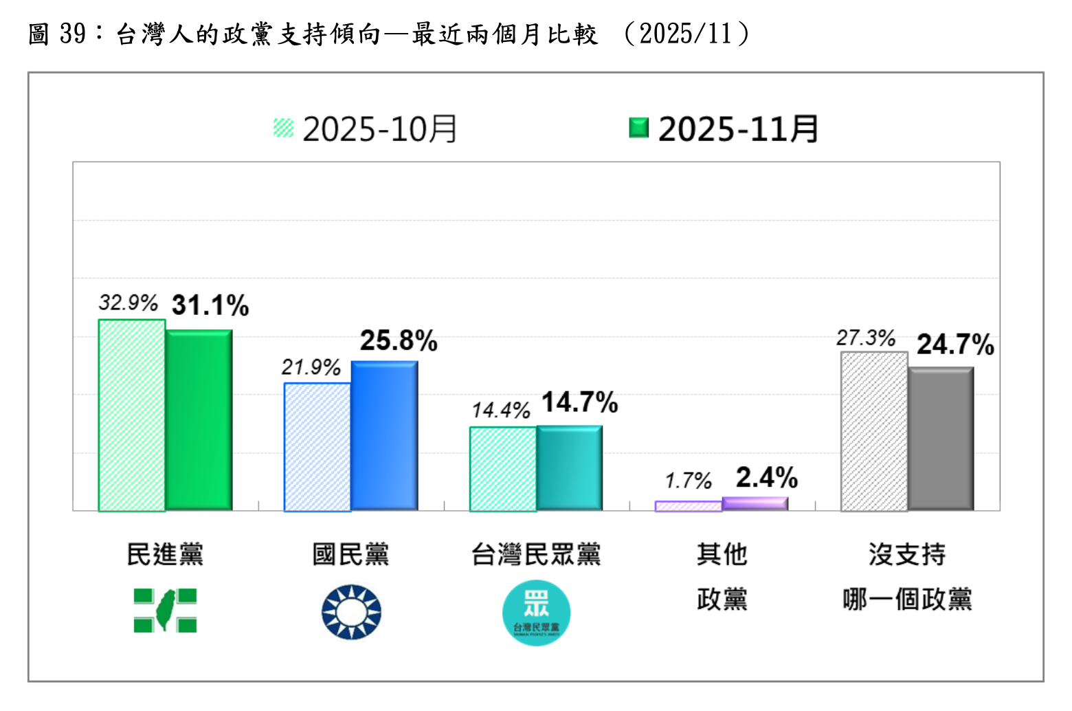 圖39:台灣人的政黨支持傾向—最近兩個月比較 (2025/11)。台灣民意基金會提供