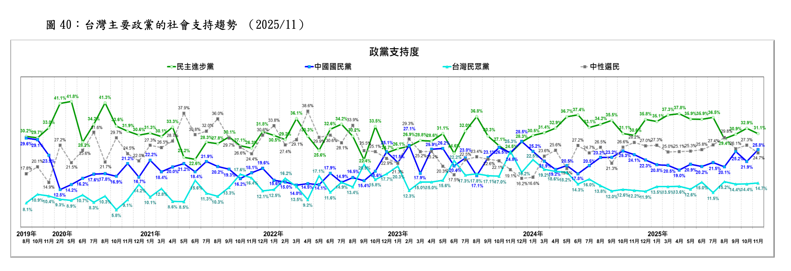 圖40:台灣主要政黨的社會支持趨勢 (2025/11)。台灣民意基金會提供