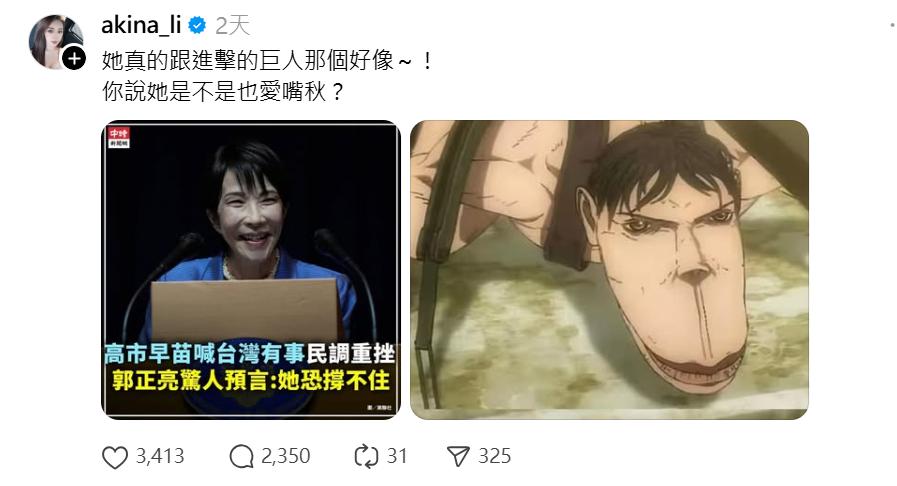 「Akina Li」屢屢在Threads上發表攻擊綠營的貼文,政治傾向明顯,近日她放上高市早苗和車力巨人的畫面,PO文:「她真的跟進擊的巨人那個好像!你說她是不是也愛嘴秋?」