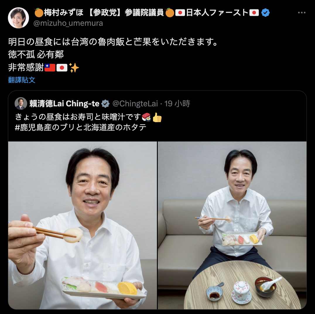 近日中國因不滿日本首相高市早苗「台灣有事」的說法,不僅呼籲國人少去日本,還突然宣布停止進口日本水產品。我國總統賴清德前天分享午餐享用日本水產品製作的壽司、味噌湯照片,以實際行動力挺,受到日本媒體、民眾矚目,日本參議員梅村瑞穗20日晚間也在X平台貼出,自己享用台灣魯肉飯、芒果的照片,直呼:「德不孤、必有鄰」,貼上台日兩國的國旗。