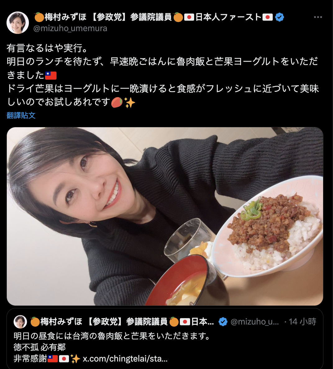 對此,日本參議員梅村瑞穗20日也在X轉發賴清德貼文說:「明天的午餐就決定吃台灣的魯肉飯配芒果了!」她並寫下「德不孤、必有鄰,非常感謝!」文末貼上台日兩國的國旗。梅村瑞穗當晚隨即貼出自己享用台灣魯肉飯、芒果的照片,表示自己「說到做到」,不過沒等到明天午餐,晚餐就吃了魯肉飯和芒果優格。她還透露自己的獨門吃法:「如果將芒果乾浸泡在優格中過夜,其口感會變得更加新鮮美味」,邀請大家不妨一試。