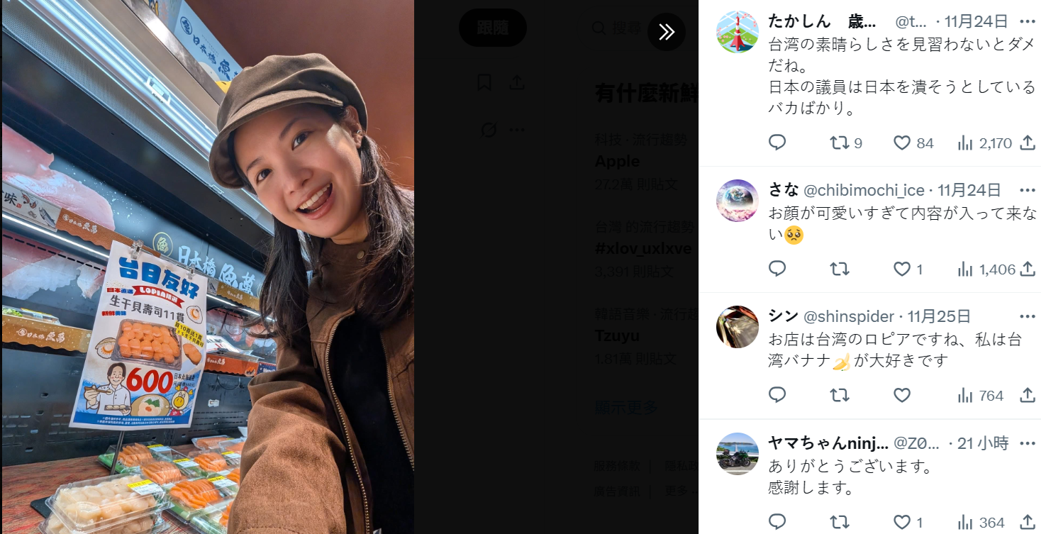 日本首相高市早苗日前因「台灣有事」言論觸怒中國,招致一連串報復措施,包括暫停日本水產進口、禁止赴日旅遊等。台灣政壇人紛紛在社群力挺,大啖日本海鮮,民進黨台北市議員林亮君宣傳日本海產的照片,也意外在日本暴紅,亮麗的外型擄獲當地一票粉絲,直呼「好可愛」!