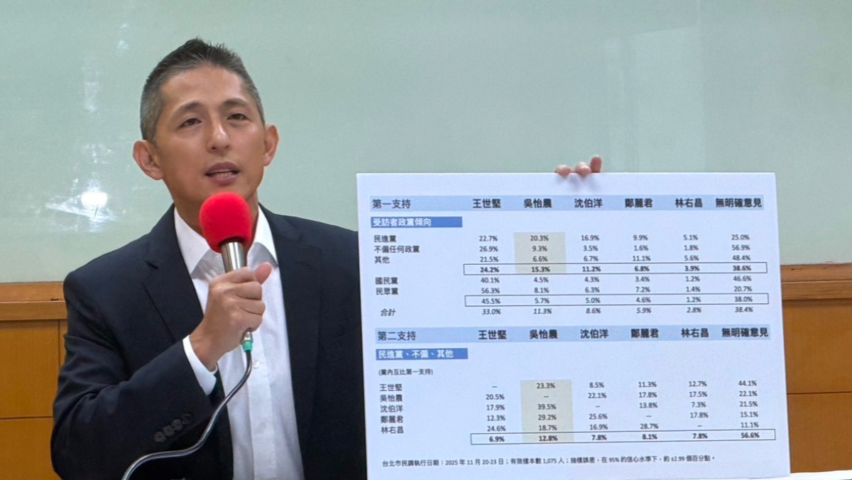 民進黨佈局2026選戰,台北市長人選引發關注,積極表態爭取提名的狀況台灣理事長吳怡農今(11/26)公布民調,包含他共5位潛在人選,在「非藍白支持者」中,綠委王世堅24.2%、吳怡農15.3%、綠委沈伯洋11.2%、行政院副院長鄭麗君6.8%、民進黨前秘書長林右昌3.9%。吳怡農表示,他雖排名第二,但他在基層中具爆發力,有底氣突破基本盤,為台北帶來改變。