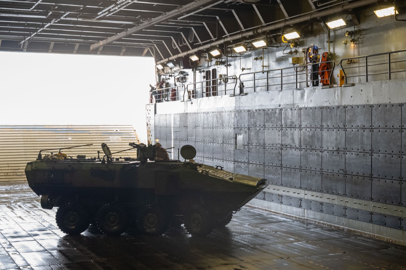 美國海軍未來無人船(ASV)可由類似兩棲運輸船塢登陸艦的「航海母艦」搭載,作戰時駛出船塢進行部署。圖為兩棲運輸船塢登陸艦「紐奧爾良號」(USS New Orleans, LPD-18)2025.10.16於日本沖繩進行兩棲登陸演練,陸戰隊的兩棲突擊車(ASV)準備駛出該艦船塢。U.S. Navy photo