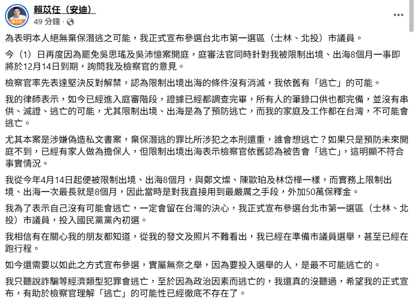 賴苡任強調,相信關心他的朋友都知道,從社群發文及照片不難看出,他已投入市議員選舉,甚至已經在跑行程,「如今還需要以如此之方式宣布參選,實屬無奈之舉,因為要投入選舉的人,是最不可能逃亡的。」