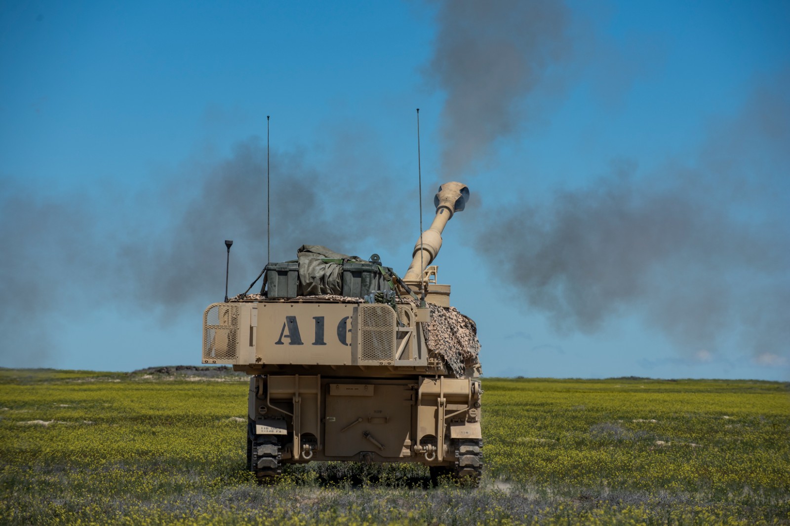 美國愛達荷州陸軍國民兵的M109A6帕拉丁155公厘口徑自走砲,發射裝有M1156「精準導引套件」(PGK)的155公厘口徑榴彈,可精準命中目標。U.S. National Guard photo