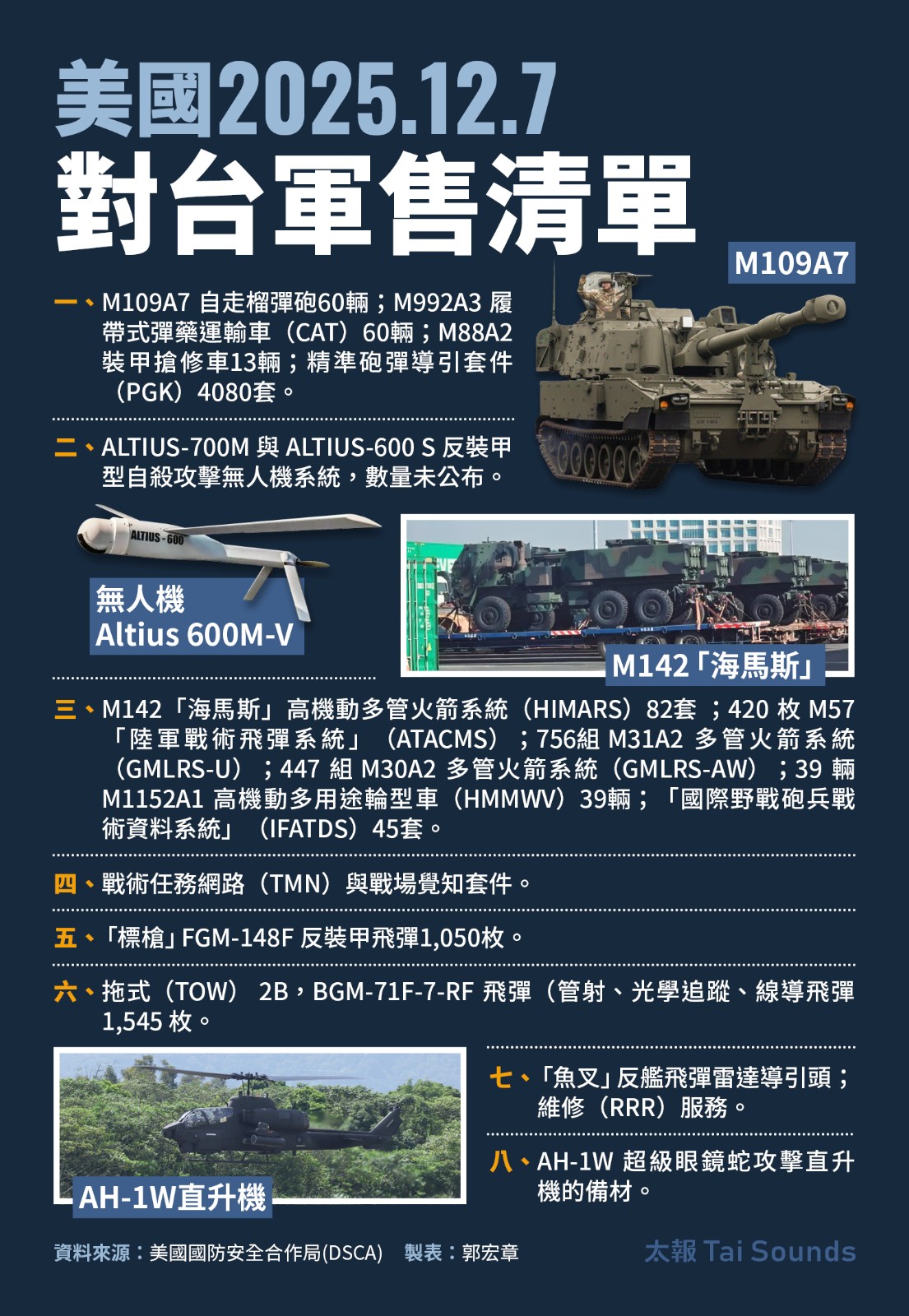 美國國防安全合作局(DSCA)於美東時間12月17日知會國會,將對台8項軍售案,總額高達111億540萬美元,軍事專家紀東昀指出,這次軍售82套海馬士系統與最新型ALTIUS-700M型反裝甲攻擊型無人機、增售數量龐大的反裝甲飛彈包括拖式2B與標槍飛彈等,整體符合美軍希望台灣持續強化不對稱戰力與灘岸打擊戰力。而出售最新型M109A7自走砲並配套「國際野戰砲兵戰術資料系統」系統(IFATDS)、精準導引套件PKG等,賦予M109A7自走砲車可以一輛車獨立作戰的能力,更能讓陸軍火砲戰力靈活運用,也符合機動作戰的需求。
