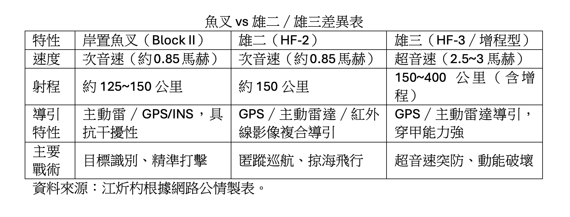 至於戰力提升重點,江炘杓分析,首先是魚叉飛彈系統可以與雄風二型與雄風三型飛彈系統之間達成「戰術互補」。這是因為魚叉飛彈(次音速)具備較佳的抗電子干擾能力與目標再辨識技術,能與雄三(超音速)搭配攻擊,增加敵艦近迫武器系統(CIWS)的攔截難度。