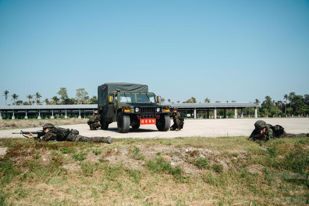 因應海軍作戰兵力編制與任務調整,海軍陸戰隊新成立戒護營車組抵達戒護陣地後迅速由悍馬車下車,實施警戒。軍聞社