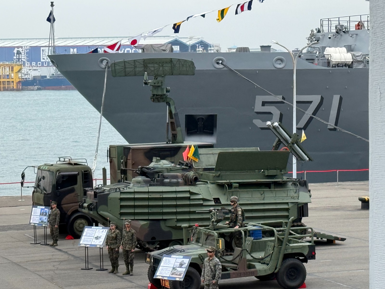 海軍新型救難艦大武軍艦(上)、AAV7兩棲突擊車掃雷車型(中)2025.11.20於高雄新濱營區首度亮相,並將於11.22營區開放供民眾參觀。郭宏章攝
