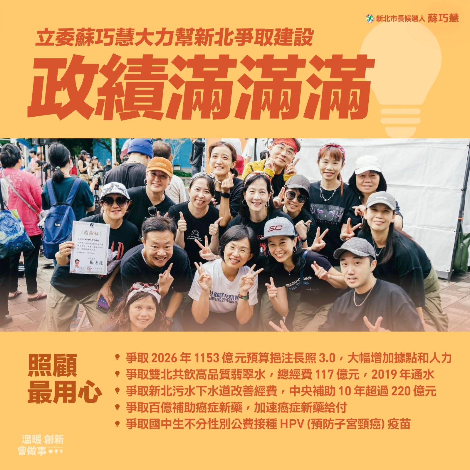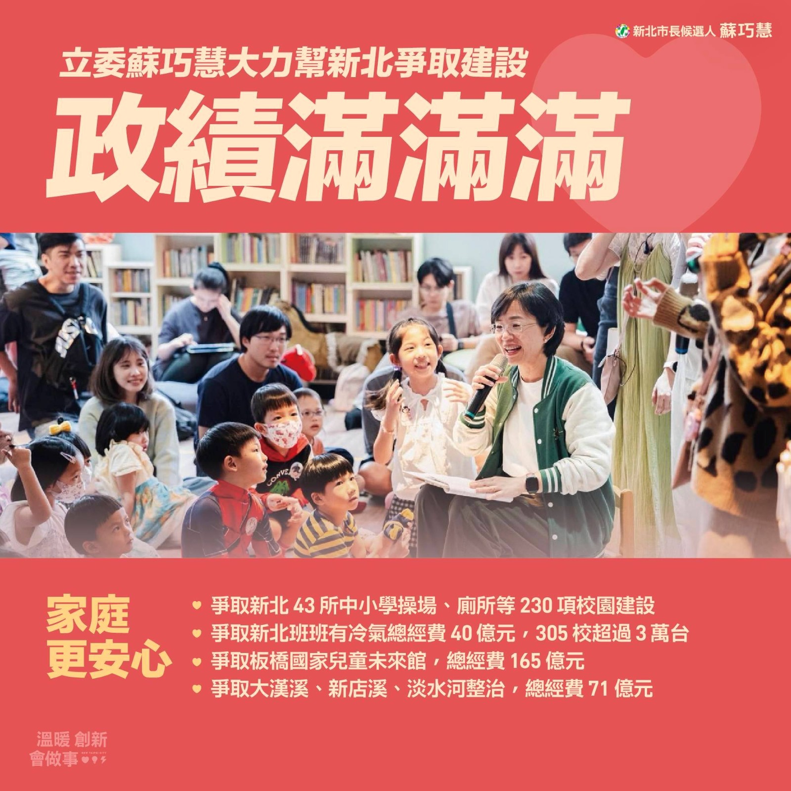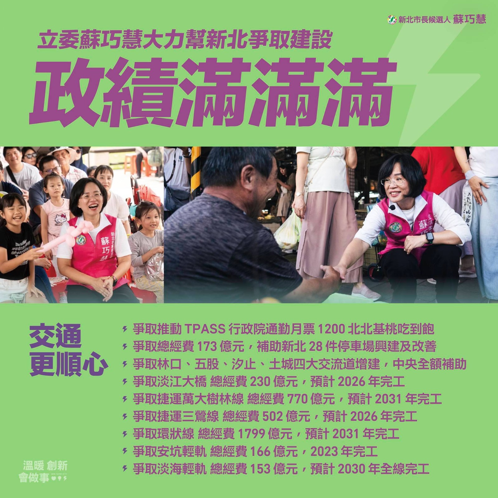 蘇巧慧表示,在立委任內持續為新北爭取各項建設,包括TPASS行政院通勤月票1200北北基桃吃到飽、林口、五股、汐止、土城四大交流道增建,捷運萬大樹林線、三鶯線、環狀線、安坑及淡海輕軌、淡江大橋,新北汙水下水道改善、班班有冷氣、板橋國家兒童未來館,以及新北43所中小學操場、廁所共230多項校園建設。