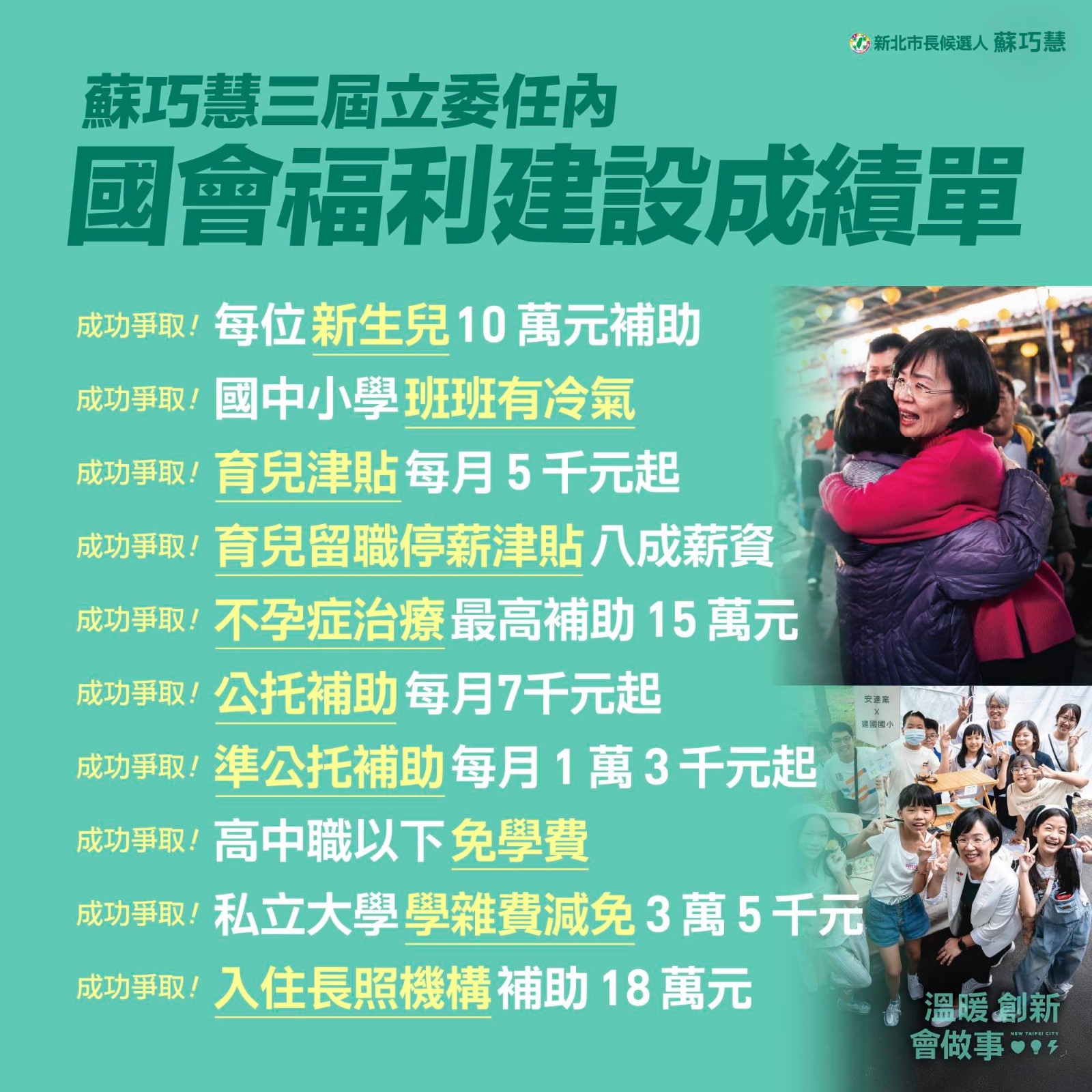 蘇巧慧也指出,她在立法院內政委員會推動多項修法,成功爭取新生兒10萬元補助、公托及準公托補助、育兒津貼、私立大學學雜費減免、高中職以下免學費、不孕症治療以及入住長照機構補助。
