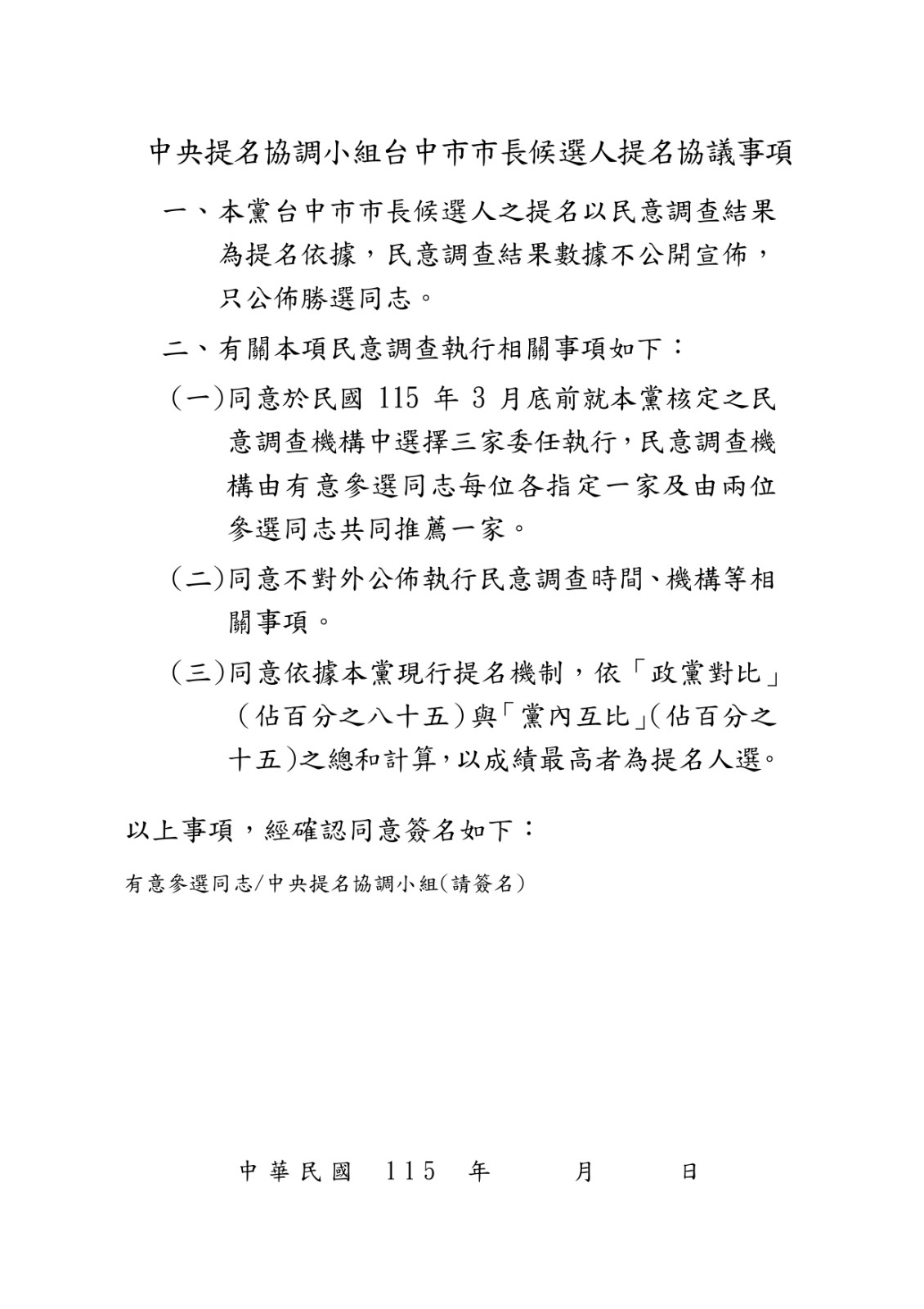國民黨台中市長提名整合卡關,黨中央下午表示,經充分溝通與說明後,2位有意參選同志(立法院副院長江啟臣與立委楊瓊瓔)皆已簽署協議,確定於3月25至31日完成民調作業。不過江傍晚發出聲明,內容違背雙方協議。