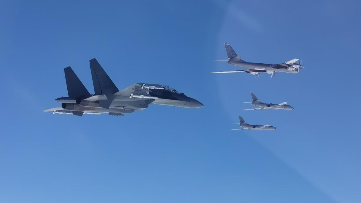 中共殲-16資料照。2024年11月29日,中俄戰機在日本海進行戰略巡航;圖左為中國殲-16,圖右最上方為俄羅斯圖-95,其下即轟-6N。翻攝微博@人民空軍